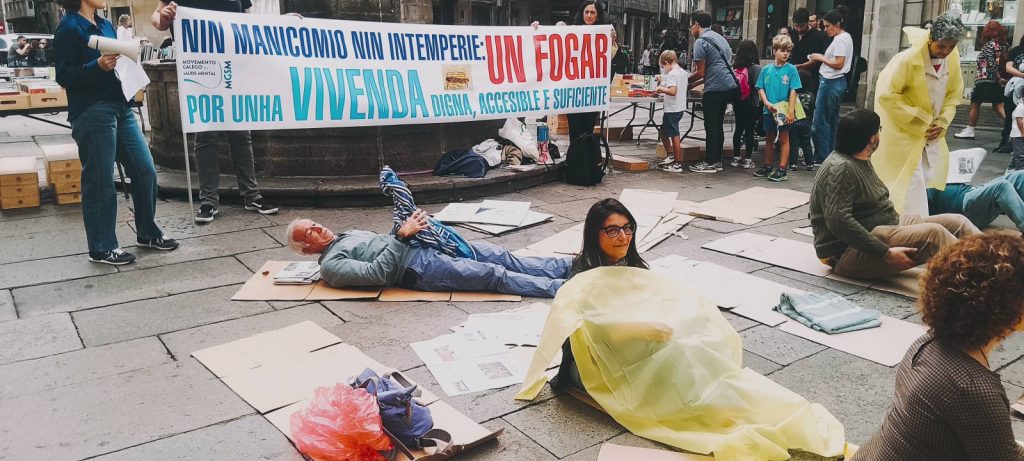 Tamén saímos á rúa para poñernos na pel das persoas sen fogar. Tombámonos no chan, entre cartóns, na cidade de Santiago de Compostela, para lembrar que a vivenda é un determinante esencial da saúde, a ocupación e a participación. Unha vivenda non é só un teito: é o lugar desde o que unha persoa pode coidarse, construir identidade, relacionarse, sentirse parte e desenvolver un plan de vida.